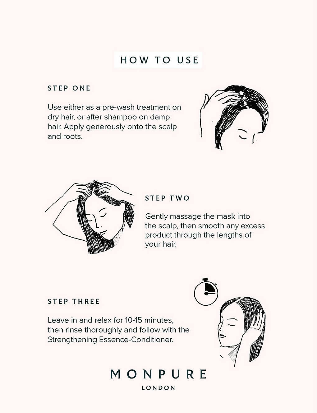 - Application: use either as a pre-wash treatment on dry hair, or after shampoo on damp hair. Apply generously onto the scalp and roots. Gently massage the mask into the scalp, then smooth any excess product through the lengths of your hair. Leave in and relax for 10-15 minutes, then rinse thoroughly and follow with conditioner